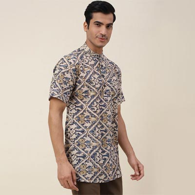 Men Beige & Blue Mandarin Collar Cotton Short Kurta