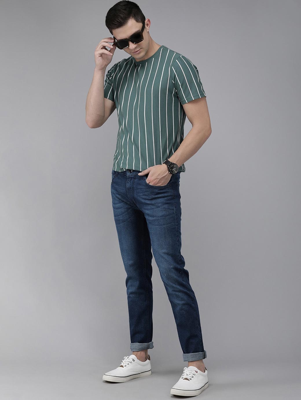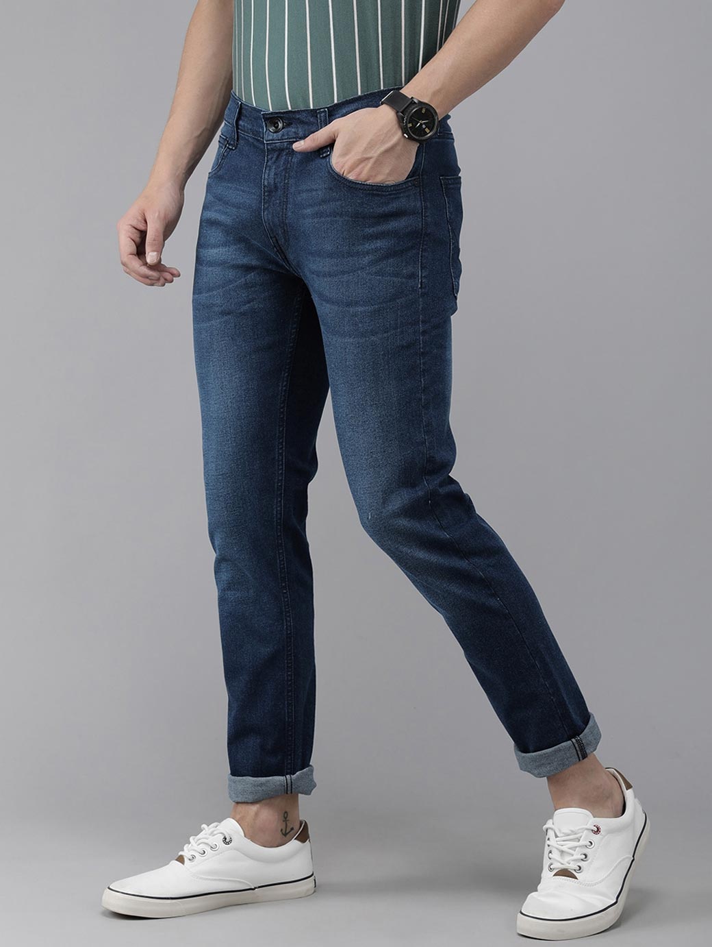 • Medium shade, light fade blue jeans