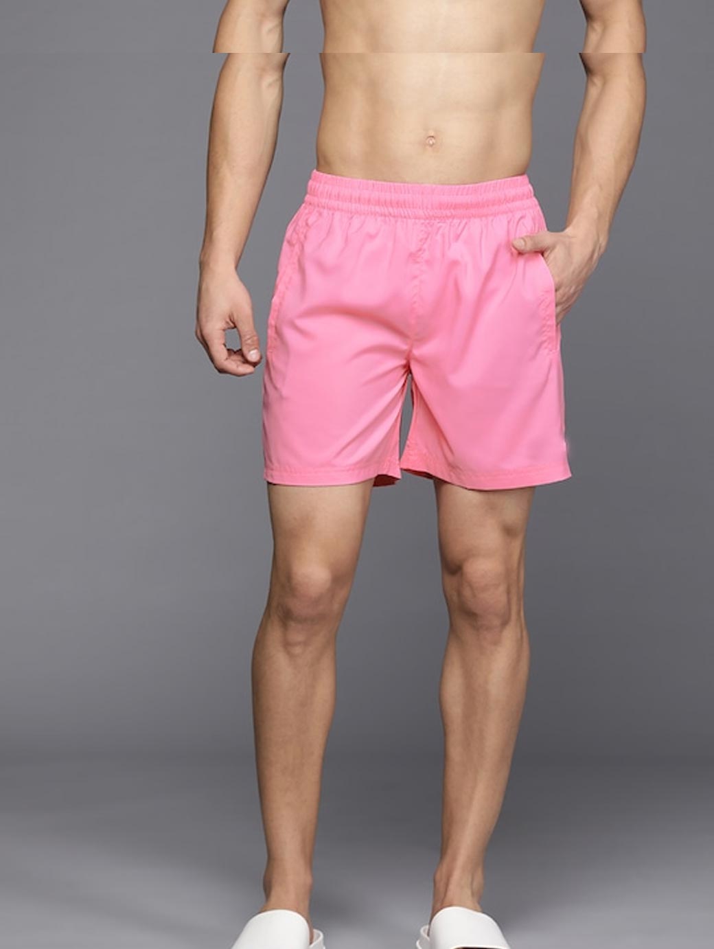 Pink Solid Swim Shorts Elastic waist Drawstring closure 2 Side pockets.
