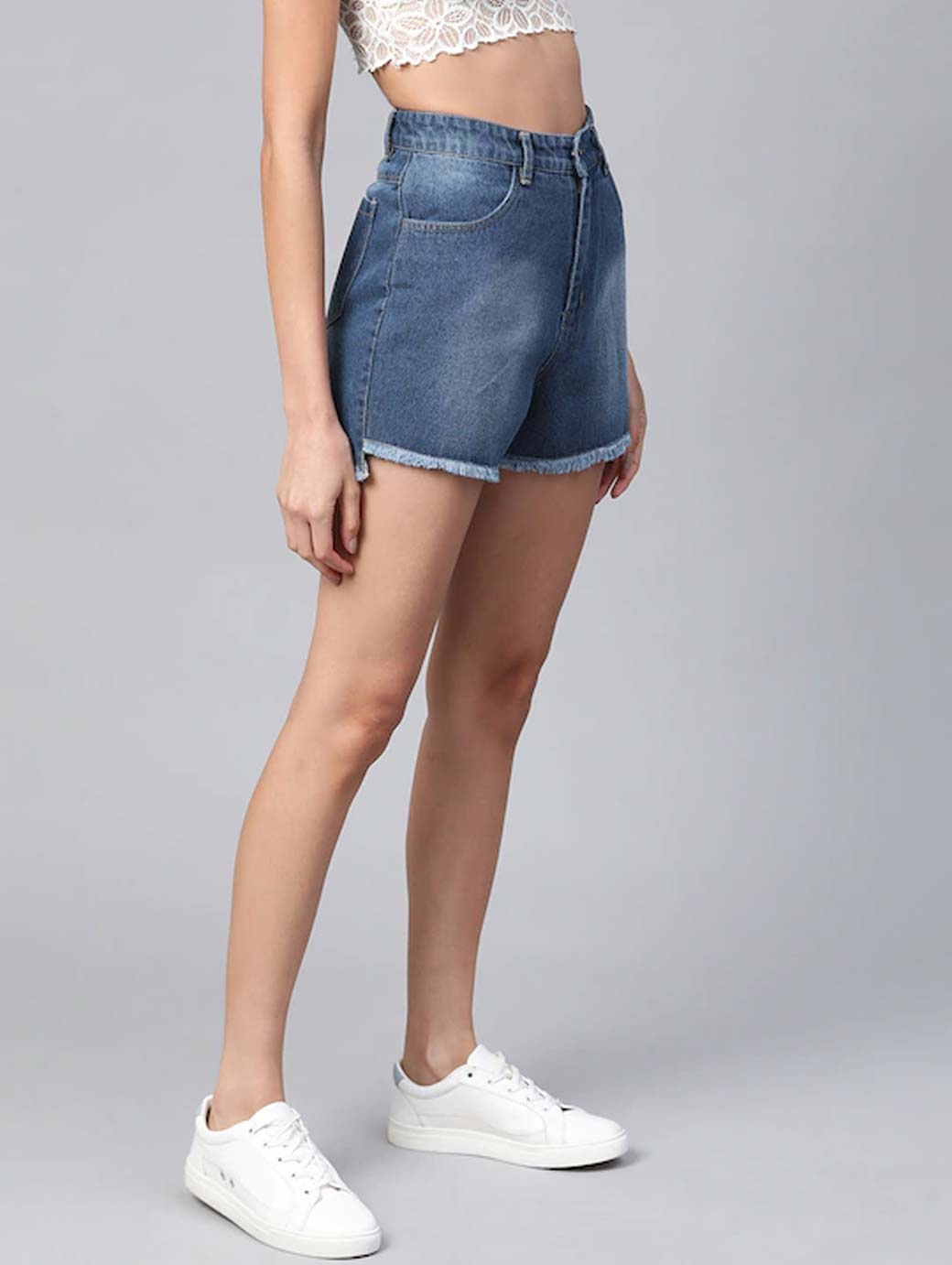 Blue washed high-rise denim shorts, has 4 pockets, button closure, frayed hem