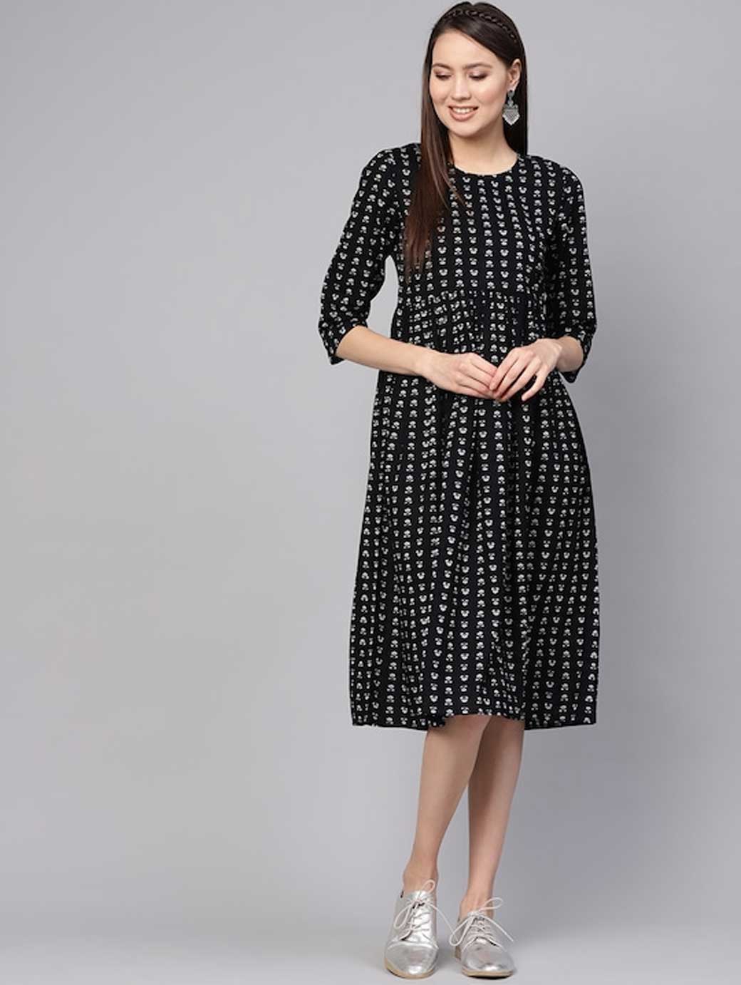 Black and Off-white printed woven A-line dress with gathered detail, has a round neck, three-quarter sleeves, and flared hem
