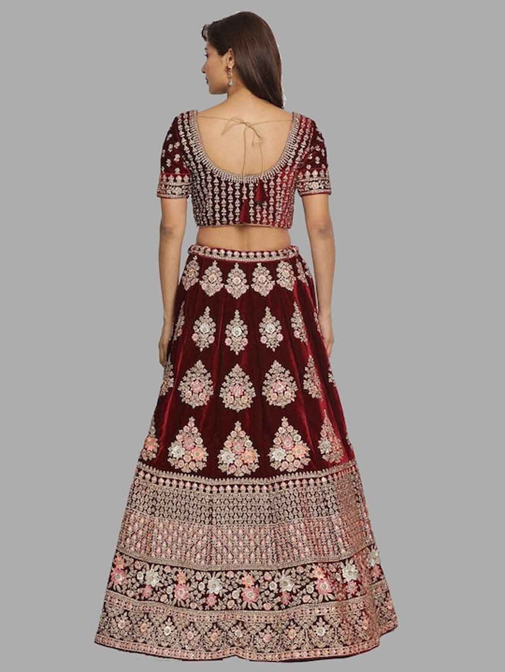 Maroon and gold-toned embroidered lehenga choli with dupatta,