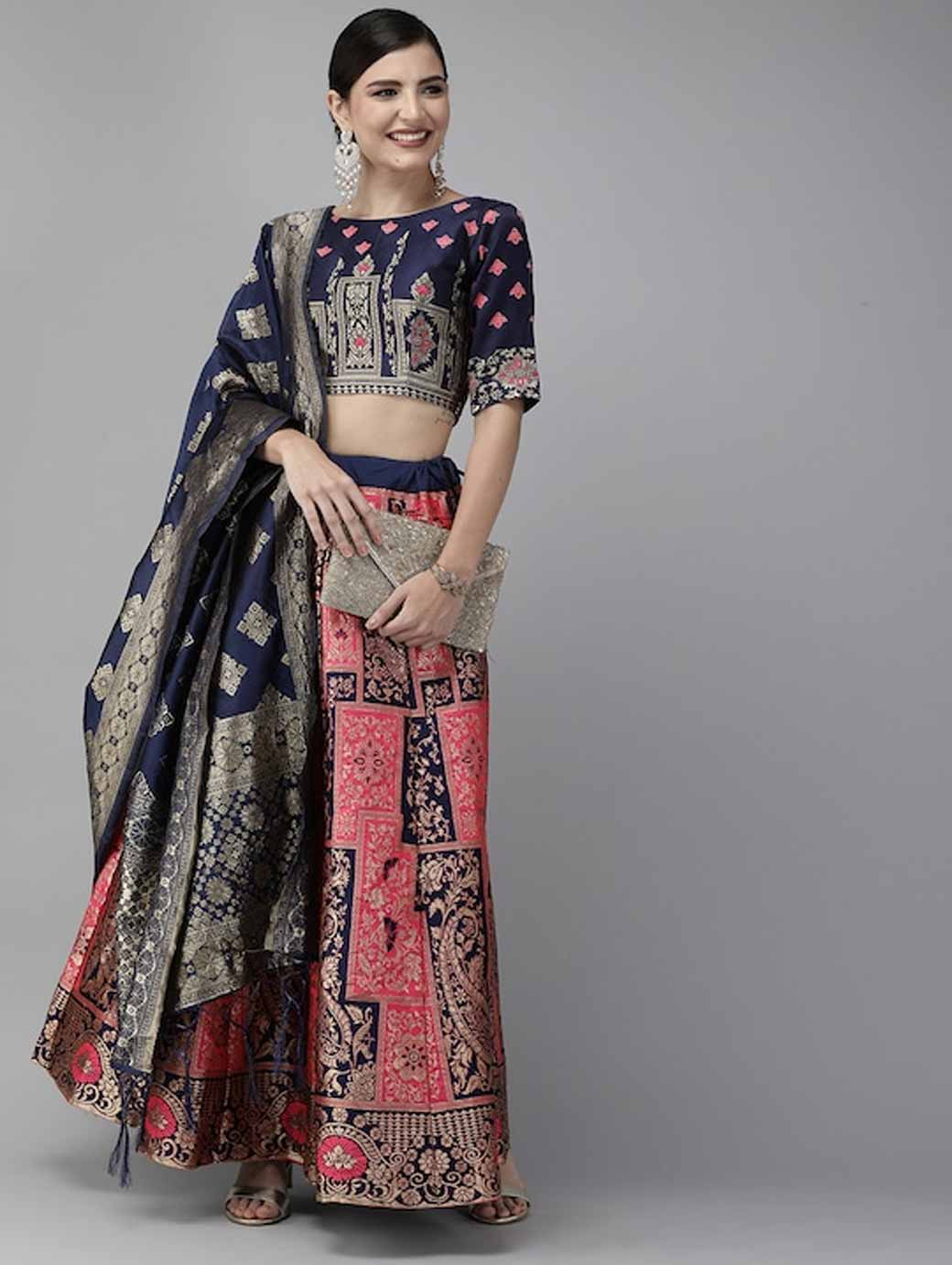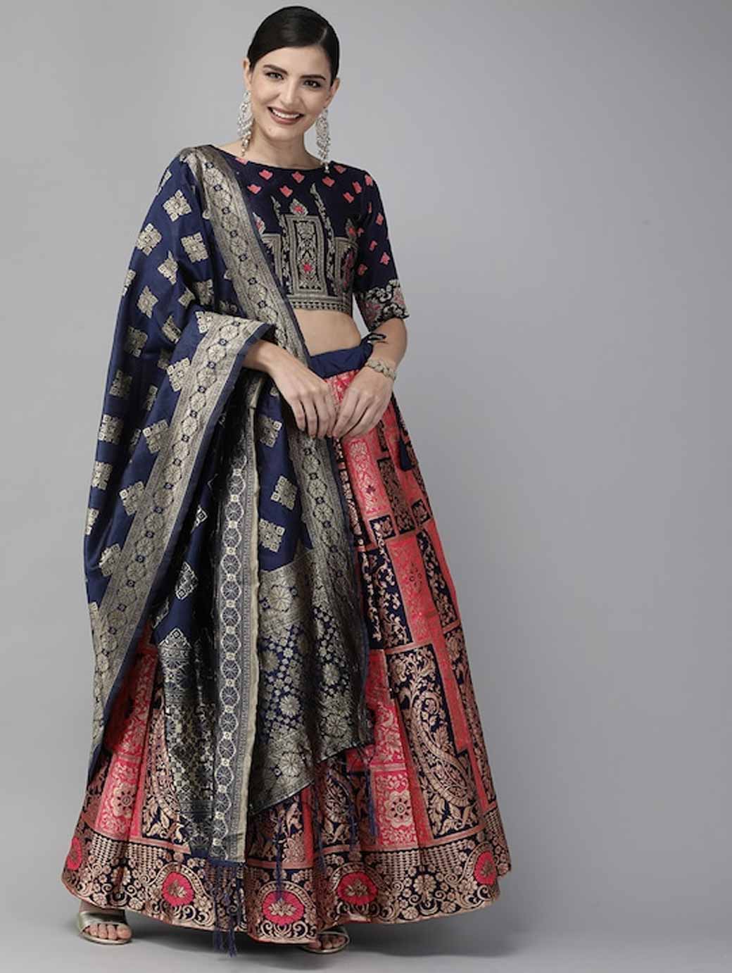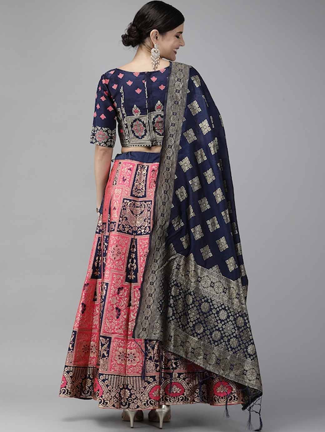 Pink & Navy Blue Woven Design Semi-Stitched Lehenga & Unstitched Blouse with Dupatta