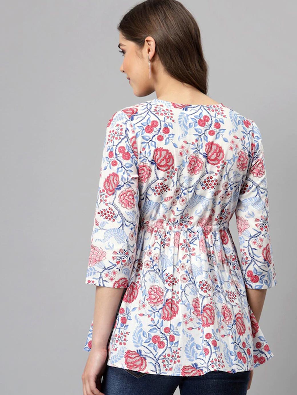White and red longline wrap top Floral print V-neck, three-quarter, regular sleeves Gathered or pleated detail Woven cotton Tie-ups closure.