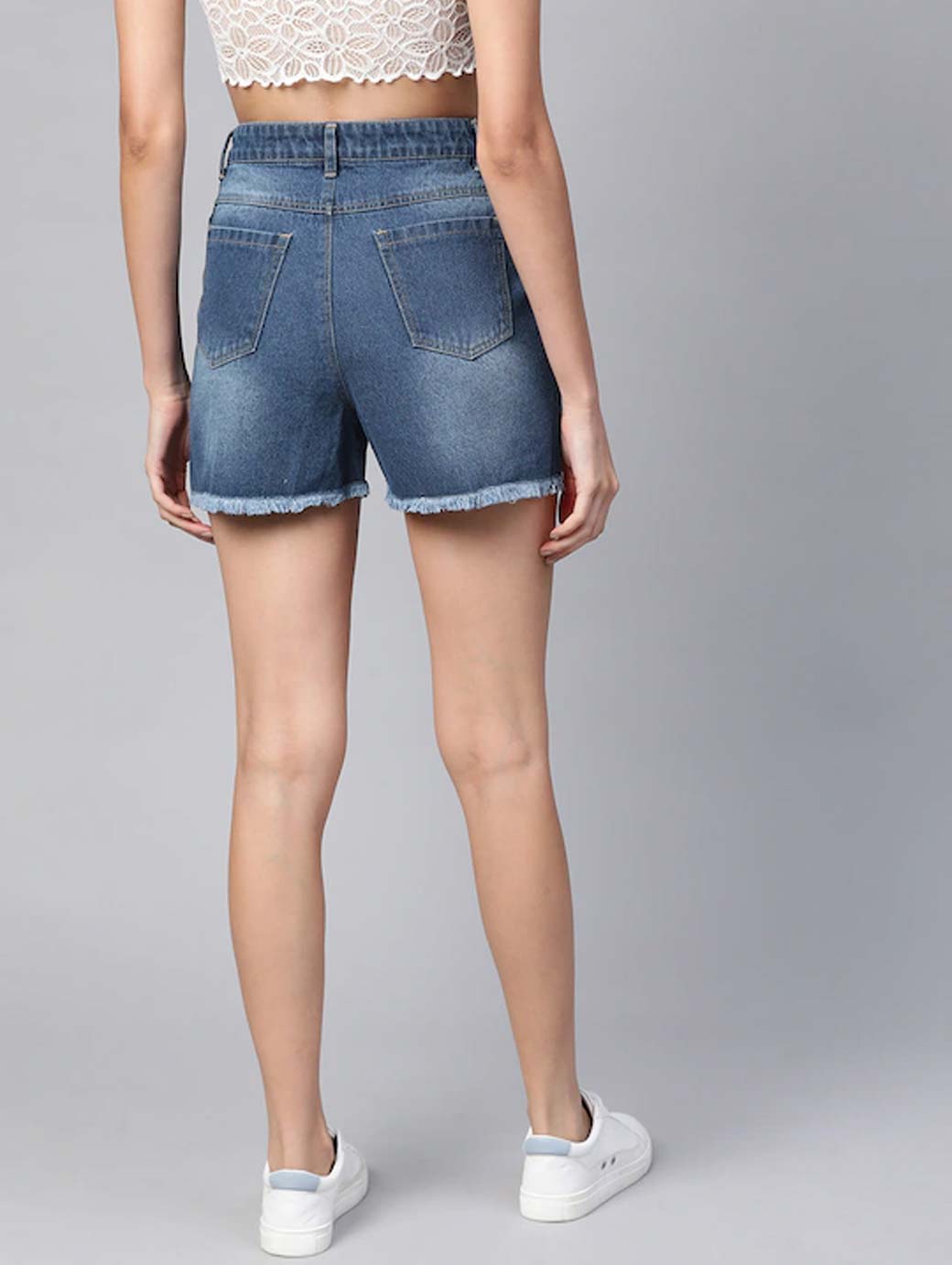Blue washed high-rise denim shorts, has 4 pockets, button closure, frayed hem